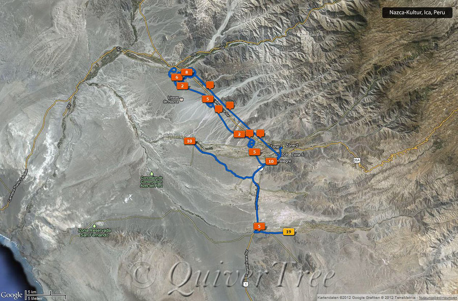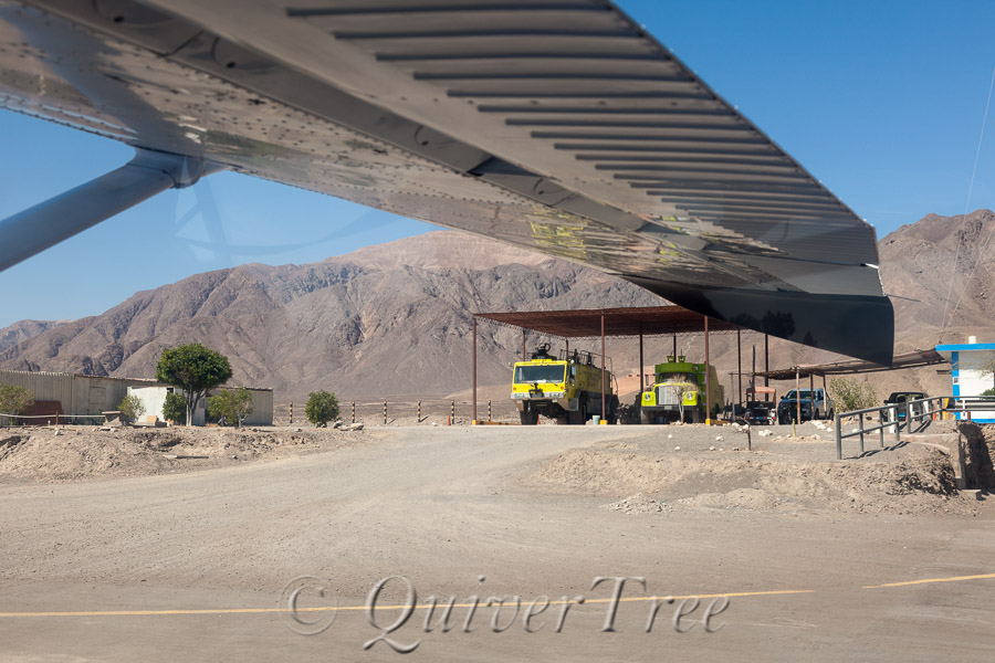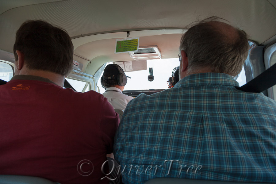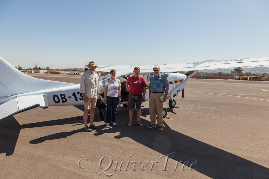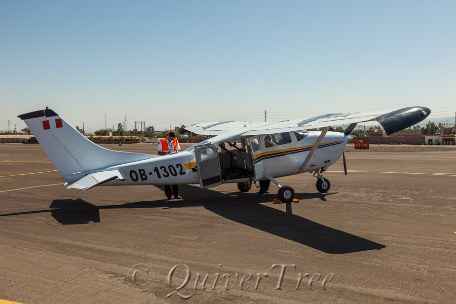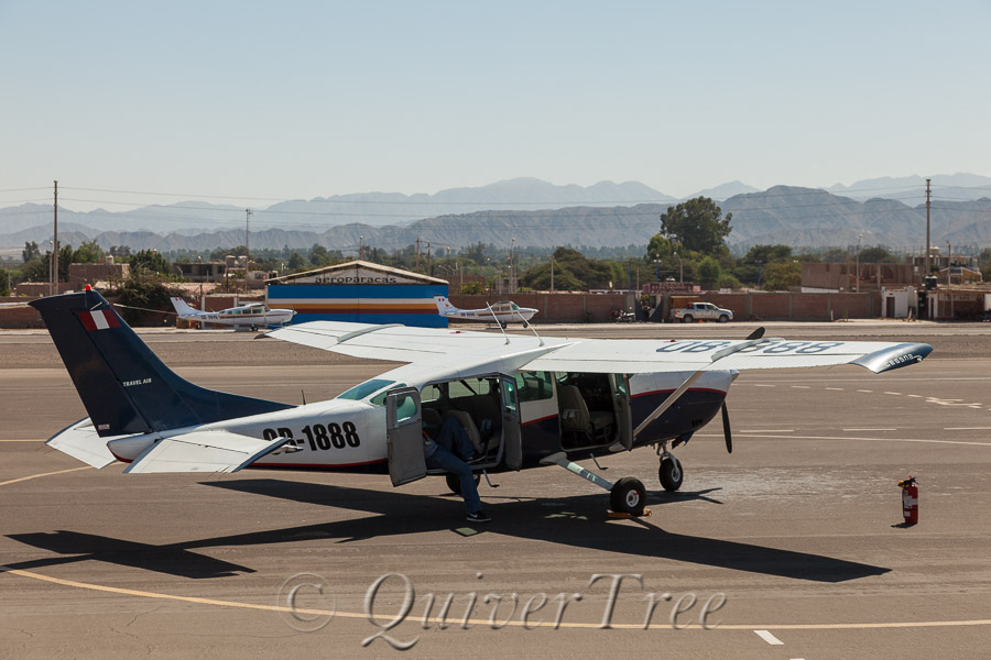 Am heutigen Nachmittag steht uns etwas ganz besonderes bevor, nämlich ein Rundflug über die Nazca-Linien. Im Terminal des kleinen Flughafens herrscht reger Betrieb, ein Flug über die Hochebene von Nazca gehört zu den Highlights eines jeden Peru-Urlaubs. Wir werden gewogen, damit die Besetzung der einmotorigen Kleinflugzeuge möglichst gut austariert werden kann. Nach einer ganzen Weile dürfen wir in unserem Flugzeug Platz nehmen, vier Passagiere und zwei Piloten. Im dem kleinen Flieger ist es eng, heiß und laut. Wir bekommen Kopfhörer, in der Tasche des Sitzes vor uns steckt eine Tüte. Für alle Fälle. Manche vertragen die Seitenlage in den engen Kurven, die der Pilot fliegen wird, nicht.
