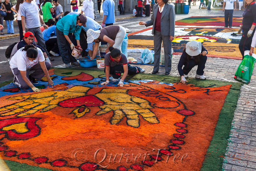 Wir besuchen die Iglesia de la Compañía, bevor wir zum zentralen Platz Arequipas kommen. Die Plaza de Armas wird beherrscht von der mächtigen Basílica Catedral de Arequipa. Auf dem Platz laufen die Vorbereitungen für die am Abend stattfindende Prozession Corpus Christi (Fronleichnam) auf Hochtouren. Kinder und Jugendliche präparieren auf dem Pflaster zahllose farbenfrohe Bilder mit biblischen Motiven.