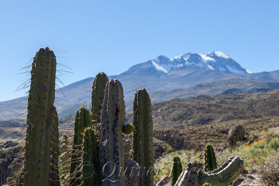Wir verlassen Arequipa in nordwestlicher Richtung. Die Straße Nummer 34A schlängelt sich kurvenreich stetig bergauf. Braune, fast vegetationslose Berge ziehen am Busfenster vorbei. Wir sind in der Pampa Cañahuasi, etwa 3800 m ü. NN. Die Straße führt am Rande der Salinas y Aguada Blanca Reserva Nacional entlang. Kleine salzhaltige Lagunen und in Büscheln wachsende Hartgräser bestimmen das Landschaftsbild.