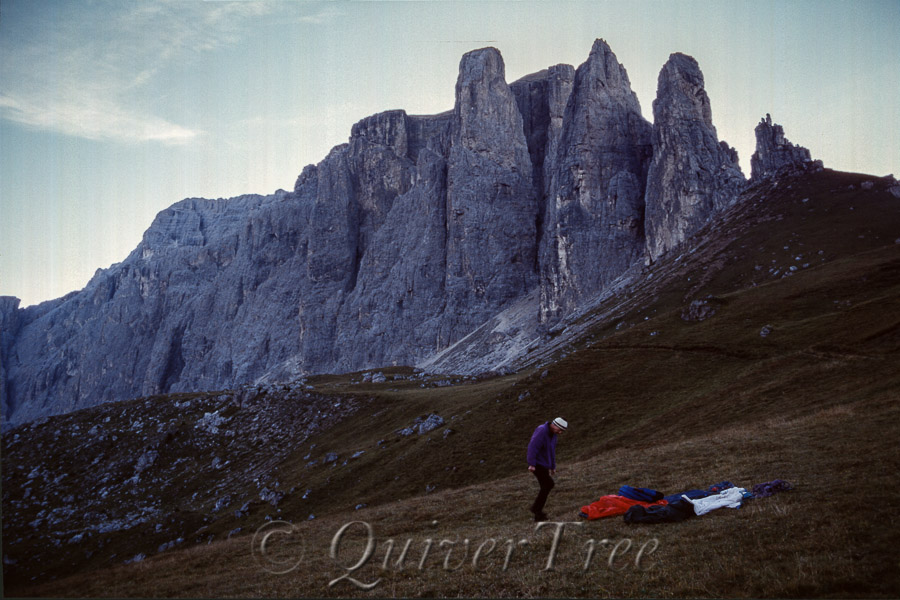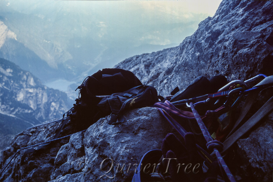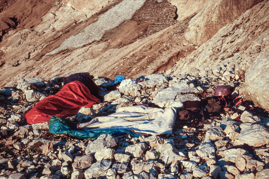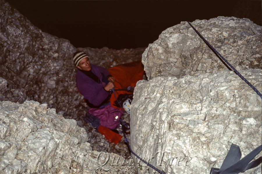 Christoph hat seinen Platz auf einem kleinen Schotterband, er kann mehr schlecht als recht liegen, aber immerhin. Ich sitze drei Meter über ihm in einer Felsnische, ein Sitzbiwak gehört nicht unbedingt zu den angenehmen Dingen einer Klettertour. Aber irgendwie bringen wir die Nacht hinter uns, die morgendliche Kälte treibt uns aus den Schlafsäcken.