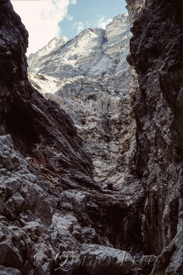 Mit kleinem Kletterrucksack, bestückt mit all den Dingen, die man für eine 1000-Meter-Wand benötigt, steigen wir in die Tour ein. Die unteren 300 Meter sind mehr oder weniger Schrofengelände, vierter bis maximal fünfter Grad, aber extrem brüchig. Hier sammelt sich alles an kleinem und großem Schutt, was die mächtige Wand von sich geworfen hat. So ist erhöhte Vorsicht geboten.