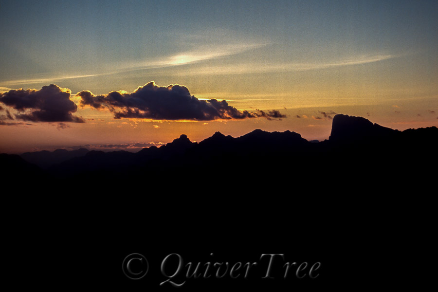 Christoph ist an diesem Tag gut drauf und führt die meisten Seillängen. Trotzdem kommen wir nur relativ langsam voran, die Wegfindung in dieser Riesenwand stellt ein nicht unerhebliches Problem dar. Da wir erst am frühen Nachmittag eingestiegen sind und keine Chance haben, noch heute den Gipfel zu erreichen, halten wir Ausschau nach einem geeigneten Biwakplatz. Irgendwo in Wandmitte finden wir den auch und richten uns gegen halb neun für die Nacht ein.