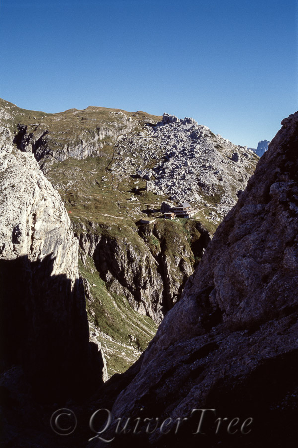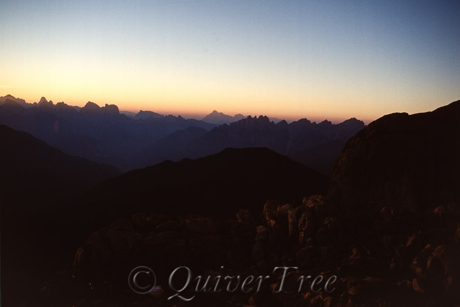 Der Abstieg auf der Rückseite der Civetta über eine Via Ferrata ist einfach, auch wenn wir wegen der einsetzenden Dunkelheit Vorsicht walten lassen müssen. Eine Stunde vor Mitternacht erreichen wir den Wandfuß, Christoph verkriecht sich sofort in seinen Schlafsack. Ich kann noch nicht, muss meiner trockenen Kehle erst noch etwas Gutes tun. In der Ferne höre ich ein leises Plätschern, irgendwo muss es Wasser geben. Mit unseren beiden Trinkflaschen mache ich mich auf den Weg und erreiche bald ein großes Schneefeld, an dessen unterem Ende kühles Schmelzwasser entspringt. Nachdem ich meinen größten Durst gestillt habe, mache ich mich auf den Rückweg. Christoph ist dankbar für die unerwartete Erfrischung.