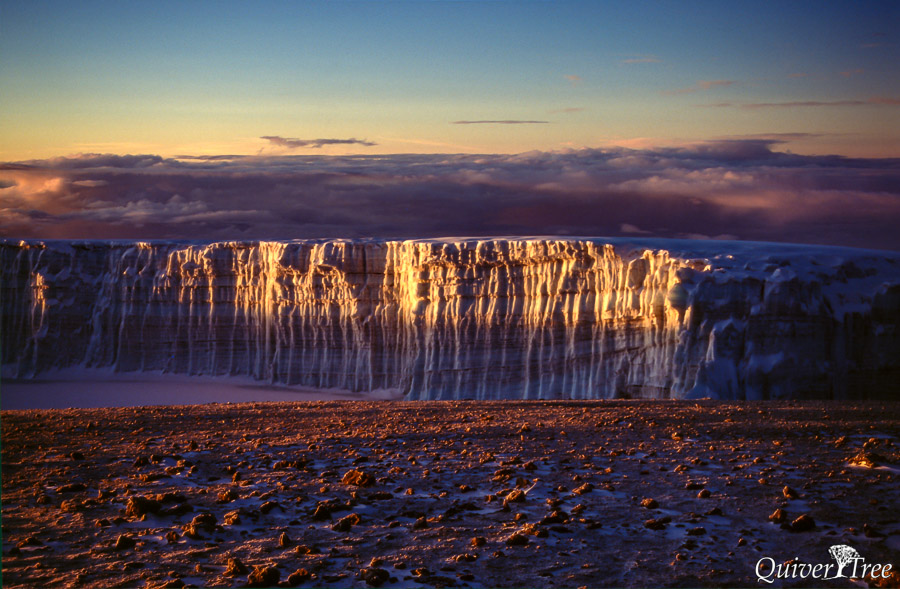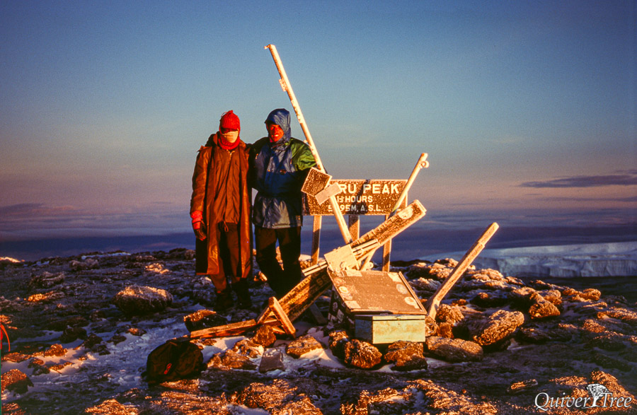 Unser Guide Simon, Detlev und ich setzen uns wieder an die Spitze. Wir kommen an der Hans Meyer Cave (5200 m) vorbei und erreichen bei Sonnenaufgang den Gilman’s Point (5685 m). Je höher wir kommen, desto schwerer fällt das Atmen. Und die Luft ist eisig kalt. Auf den letzten zweihundert Höhenmetern steigt der Weg nur noch mäßig an. Dann erreichen wir den höchsten Punkt, den Uhuru Peak (5895 m). Wir sind am Ziel. Und wir haben Glück, der Gipfel ist frei von Wolken, uns bietet sich ein atemberaubender Blick. Die Gletscher würde man eher in der Antarktis vermuten denn auf dem Dach Afrikas.