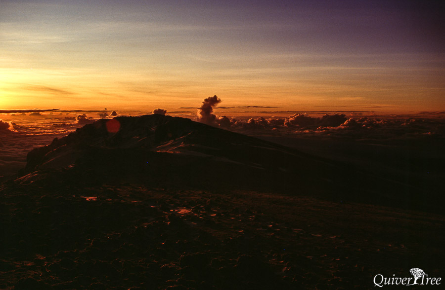 Obwohl es erst halb ein Uhr nachts ist, braucht niemand einen Wecker, richtig geschlafen hat sicher keiner. Gegen ein Uhr verlassen wir die Kibo Huts. Es ist ziemlich kalt, beim Bergaufgehen wird uns aber schnell warm. In kleinen Serpentinen schlängelt sich der Weg den langen Rücken des Kibo hinauf. Auf dem gerölligen Untergrund läuft es sich oft wie auf einem Kohlenberg: zwei Schritte vorwärts, einer zurück.
